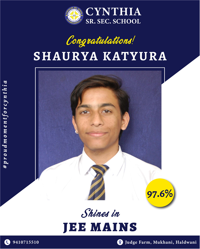 Cynthia School proudly celebrates the remarkable achievement of our student, Shaurya Katyura, who has secured an outstanding 97.6 percentile in JEE Mains. His dedication, perseverance, and consistent hard work have led him to this commendable success. Shaurya’s achievement is a true reflection of his academic excellence and determination to excel in one of the most competitive examinations in the country. The school congratulates him on this milestone and wishes him continued success in all his future endeavors.
